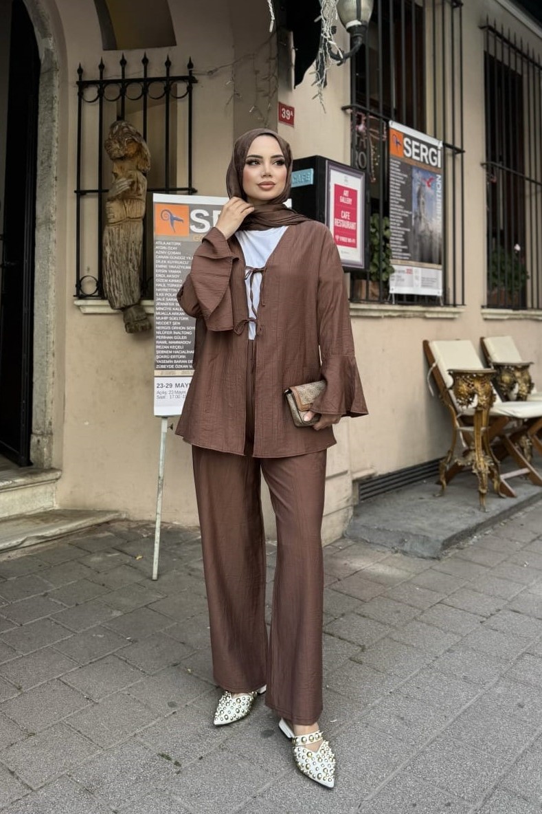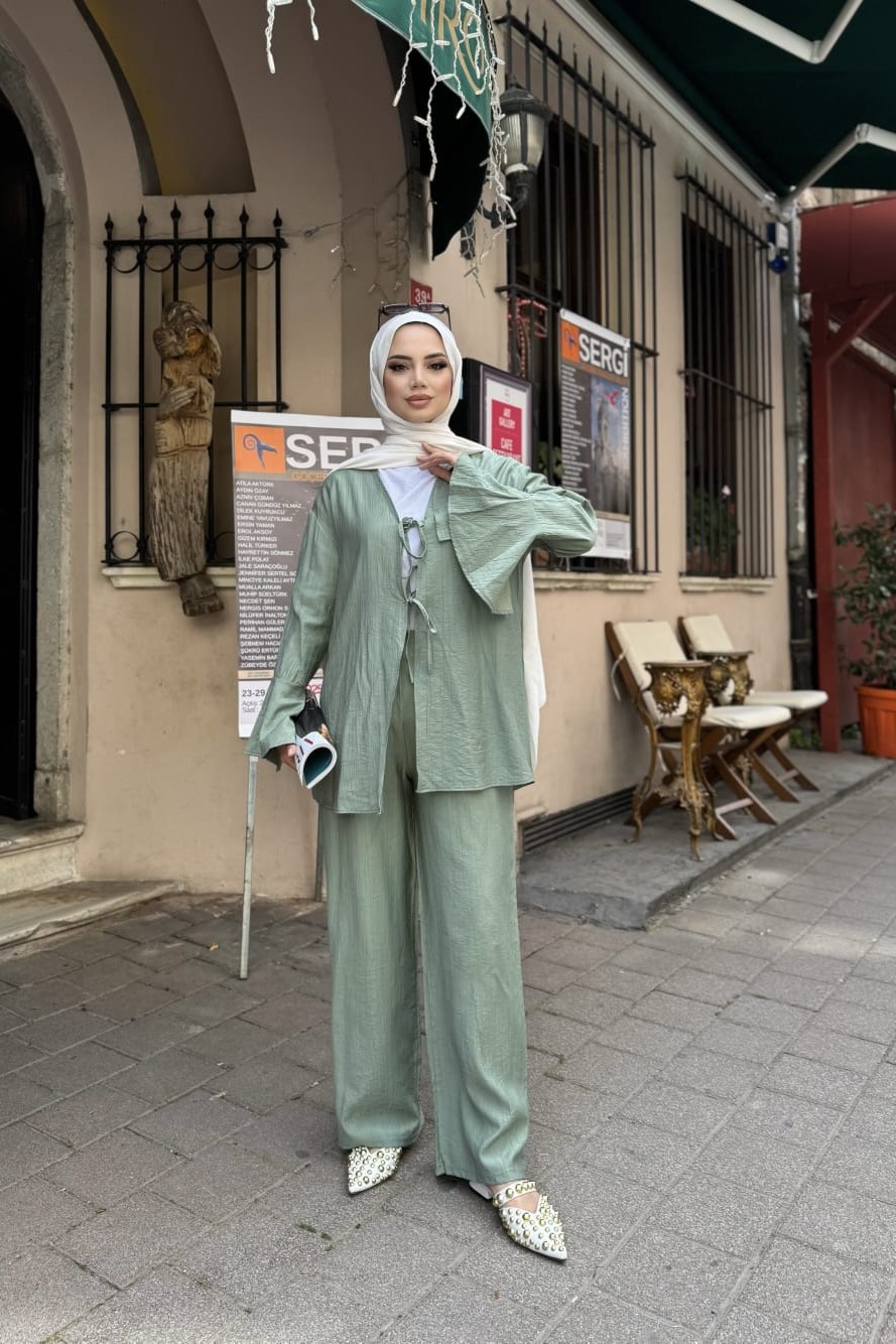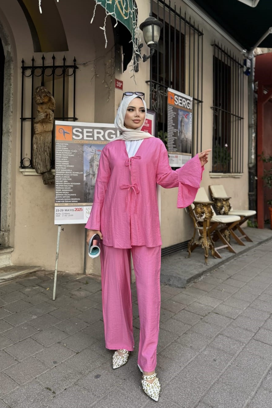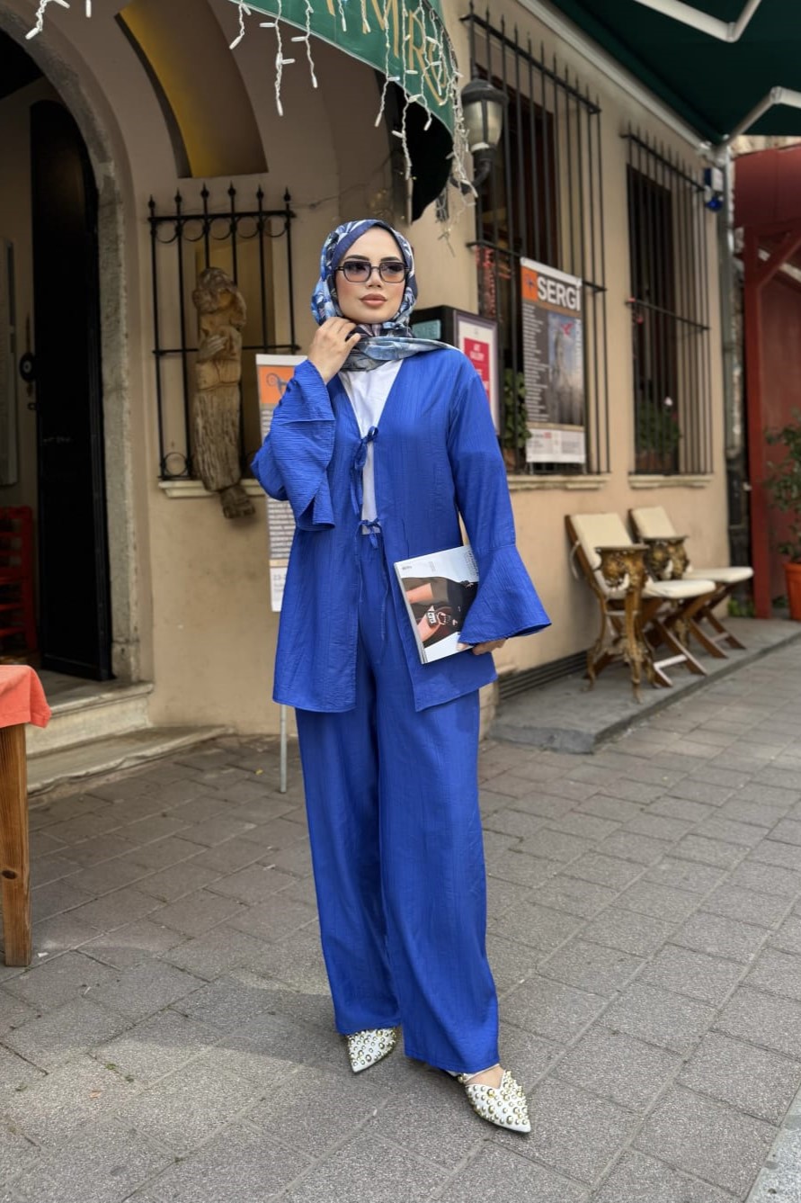 Rahat Akış İkili Takım; her anınıza eşlik edecek, şıklığı ve konforu bir araya getiren zamansız bir parça. Hafif ve nefes alan kumaşı sayesinde sıcak havalarda dahi ferah bir kullanım sunar. Geniş paçalı pantolonu ve bol kesim üstüyle zarif bir siluet oluştururken, her vücut tipine uyum sağlar.